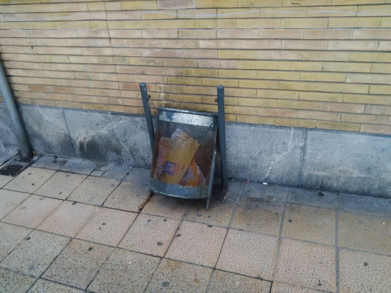 De papeles sigue yendo el asunto. Hoy nos llega a través de nuestra sección "Más que mil palabras" esta foto de una papelera "caída en combate", que también podríamos decir "caída en acto de servicio".