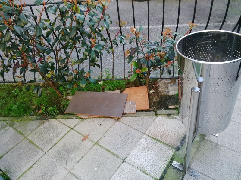 Goyito del Coto vuelve a enviarnos una foto. La gente deposita azulejos junto a las papeleras. Nos dice Goyito que pasó el barrendero y no lo recogió
