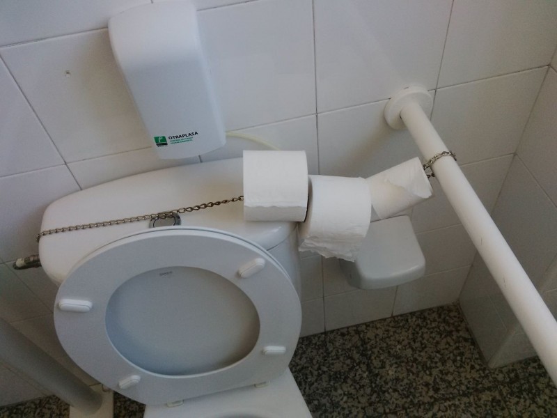 "Xurde Amoral" nos envía esta foto de los aseos de la Casa de la Música, denunciando el poco civismo de la gente que se lleva los rollos de papel higiénico a su casa y han tenido que acabar poniendo cadenas al papel. Aunque ya hay soportes para guardar el papel bajo llave.