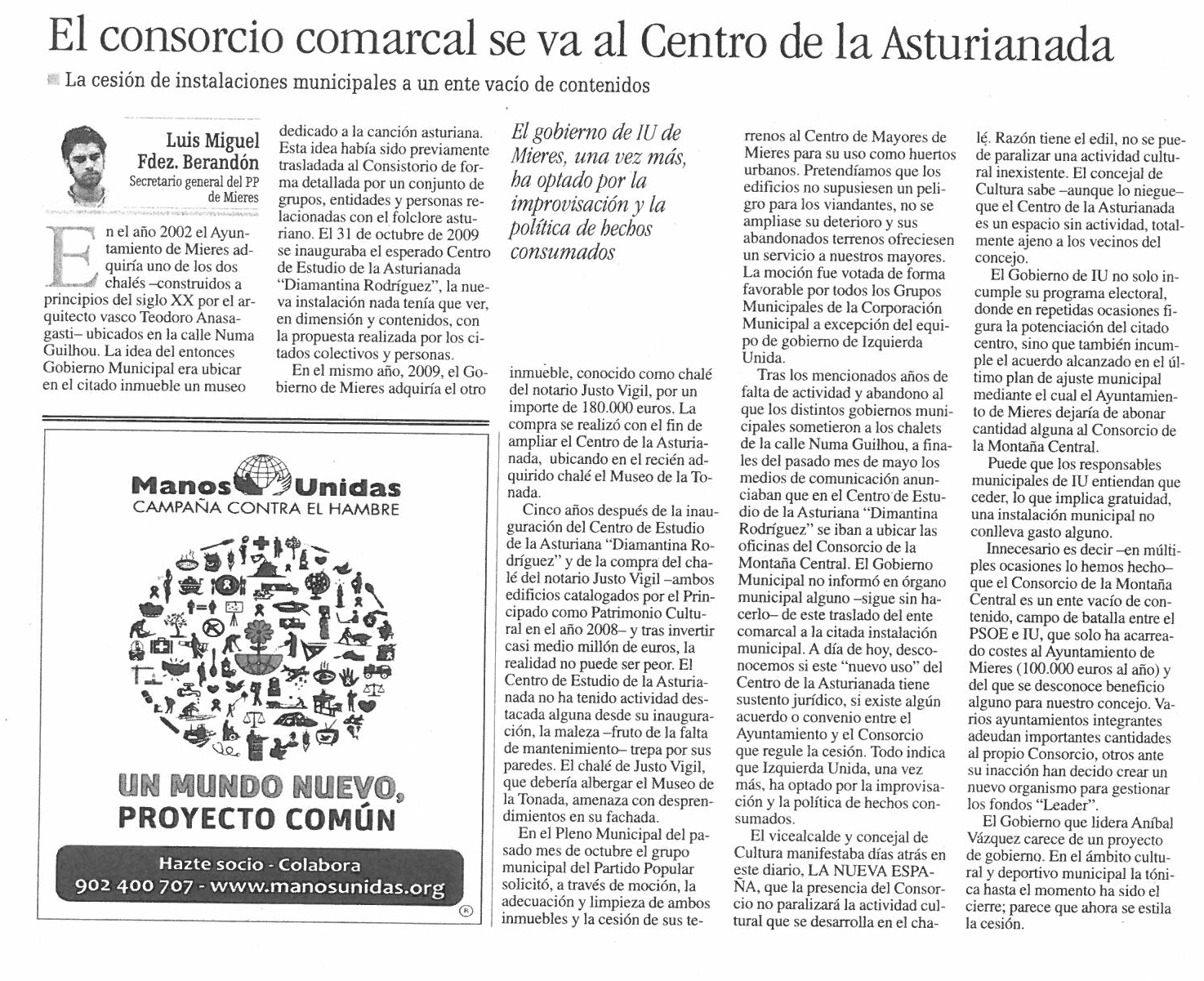 Innecesario es decir -en múltiples ocasiones lo hemos hecho- que el Consorcio de la Montaña Central es un ente vacío de contenido, campo de batalla entre el PSOE e IU, que solo ha acarreado costes al Ayuntamiento de Mieres (100.000 euros al año) y del que se desconoce beneficio alguno para nuestro concejo. Varios ayuntamientos integrantes adeudan importantes cantidades al propio Consorcio, otros ante su inacción han decido crear un nuevo organismo para gestionar los fondos "Leader".