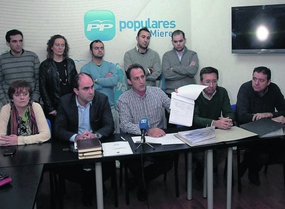 El PP de Mieres, avalado por el PP regional, trató así de zanjar la polémica surgida en los últimos días, desde que un grupo de militantes y antiguos cargos de esta misma formación política, «no más de seis» matizaba el propio 'Lito', acusó a este último de haber cobrado en «'B'» esos 40 cheques, por un valor de 28.060 euros. Afirmación que basaban en la falta de conocimiento de dichos cobros por parte de la militancia y los cargos del partido. También les causaba sorpresa que cada mes, incluidos julio y agosto, cobrase la misma cantidad y atribuida a los mismos concepto. En 31 cheques, según la documentación presentada en su momento, se abonó al presidente 760 euros y al disminuir la aportación municipal a los grupos políticos los cheques, los nueve restantes, bajaron hasta los 500 euros. El presidente de los populares y edil en Mieres responsabilizaba de esa acusación a un concejal y aunque no pronunció su nombre durante la rueda de prensa que había convocado, quedó claro que se refería a Luis Miguel Fernández Berandón. Y es que ayer le acompañaron los otros dos ediles del PP en Mieres.