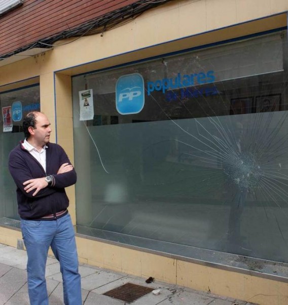 La sede del PP de Mieres amaneció ayer con una de sus lunas destrozada. La Policía investiga los hechos, aunque todo indica que un grupo de personas tiraron contra el local uno de los pesados soportes de cemento que una cafetería anexa utiliza para fijar las sombrillas de su terraza. Fue precisamente el propietario de este céntrico establecimiento el que dio aviso a la Policía Local de lo sucedido, al encontrarse los daños cuando procedía a abrir su negocio. En la fotografía, el secretario general de PP de Mieres, Damián Luis Ojeda, observando los daños causados en la luna de la sede del partido.