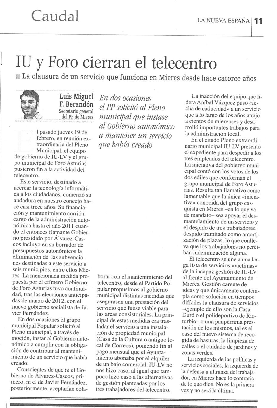 El telecentro se une a una larga lista de servicios "víctimas" de la incapaz gestión de IU-LV al frente del Ayuntamiento de Mieres. Gestión carente de ideas y que únicamente contempla como solución en tiempos difíciles la clausura de servicios -ejemplo de ello son la Casa Duró o el polideportivo de Rioturbio- o una paupérrima prestación de los mismos, tal es el caso del nuevo sistema de recogida de basuras, la limpieza de calles o el cuidado de jardines y zonas verdes.