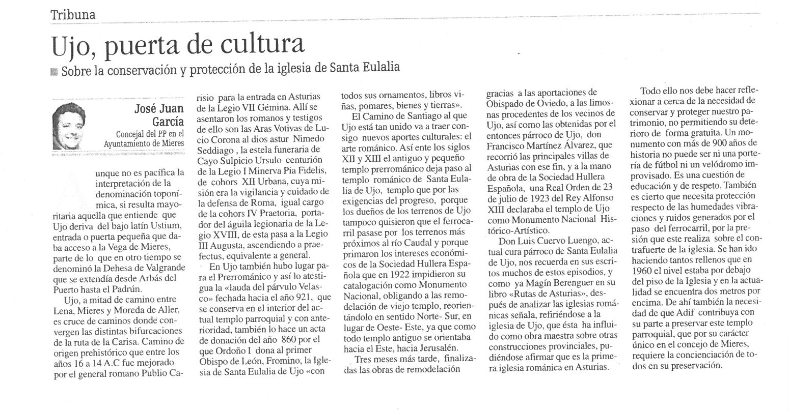En Ujo también hubo lugar para el Prerrománico y así lo atestigua la "lauda del párvulo Velasco" fechada hacia el año 921, que se conserva en el interior del actual templo parroquial y con anterioridad, también lo hace un acta de donación del año 860 por el que Ordoño I dona al primer Obispo de León, Fromino, la Iglesia de Santa Eulalia de Ujo "con todos sus ornamentos, libros viñas, pomares, bienes y tierras".