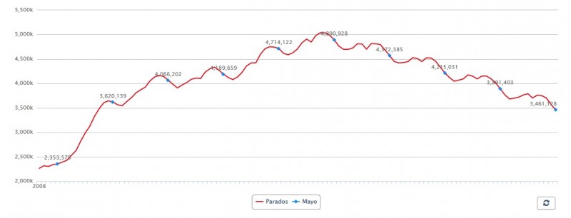 El volumen total de parados alcanzó a finales de mayo la cifra de 3.461.128 desempleados, su nivel más bajo desde enero de 2009.