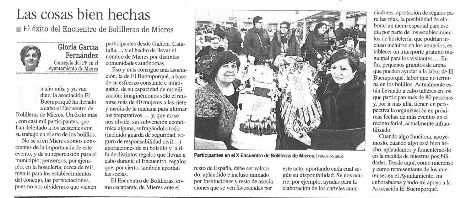 El Encuentro de Bolilleras, como escaparate de Mieres ante el resto de España, debe ser valorado, aplaudido e incluso mimado por Instituciones y resto de asociaciones que se ven favorecidas por este acto, aportando cada cual según su disponibilidad. Se nos ocurre, por ejemplo, ayudas para la elaboración de los carteles anunciadores, aportación de regalos para las rifas, la posibilidad de elaborar un menú especial para ese día por parte de los establecimientos de hostelería, que podrían incluso incluirse en los anuncios, establecer un transporte gratuito municipal para los visitantes?. En fin, pequeños granitos de arena que pueden ayudar a la labor de El Buemporqué, labor que no termina en los bolillos. Actualmente están llevando a cabo talleres en los que participan más de 80 personas y, por ir más allá, tienen en perspectiva la organización en próximas fechas de más eventos en el recinto ferial, actualmente infrautilizado.