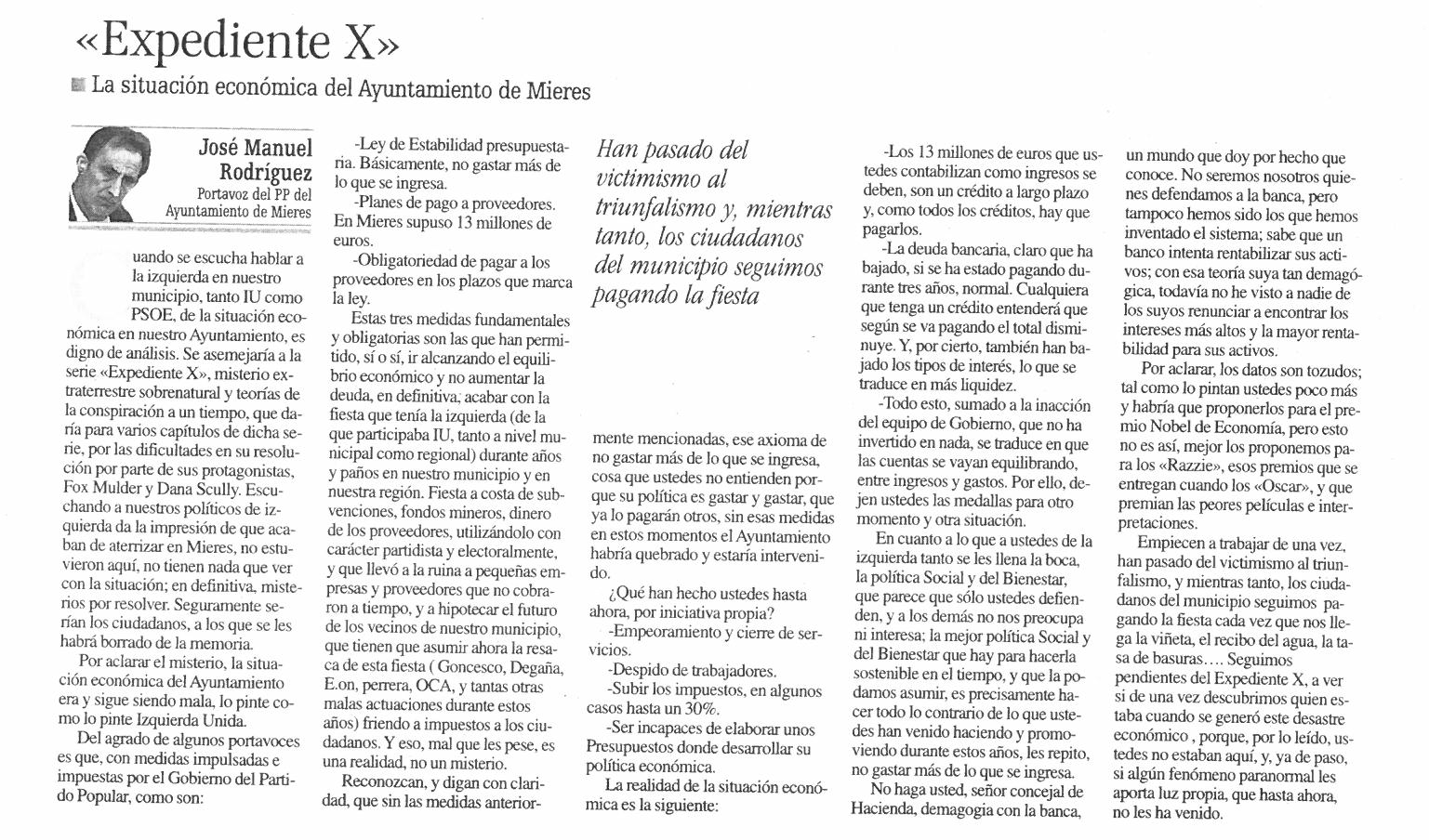Cuando se escucha hablar a la izquierda en nuestro municipio, tanto IU como PSOE, de la situación económica en nuestro Ayuntamiento, es digno de análisis. Se asemejaría a la serie "Expediente X", misterio extraterrestre sobrenatural y teorías de la conspiración a un tiempo, que daría para varios capítulos de dicha serie, por las dificultades en su resolución por parte de sus protagonistas, Fox Mulder y Dana Scully. Escuchando a nuestros políticos de izquierda da la impresión de que acaban de aterrizar en Mieres, no estuvieron aquí, no tienen nada que ver con la situación; en definitiva, misterios por resolver. Seguramente serían los ciudadanos, a los que se les habrá borrado de la memoria.