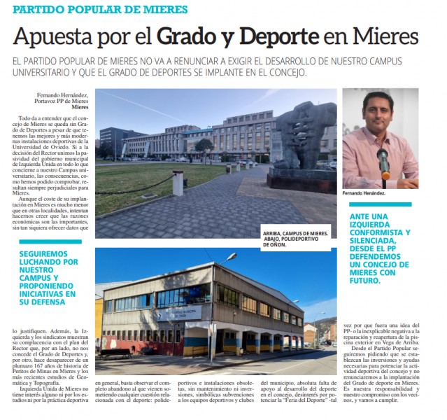 Desde el Partido Popular seguiremos pidiendo que se establezcan las inversiones y ayudas necesarias para potenciar la actividad deportiva del concejo y no renunciaremos a la implantación del Grado de Deporte en Mieres. Es nuestra responsabilidad y nuestro compromiso con los vecinos, y vamos a cumplir.